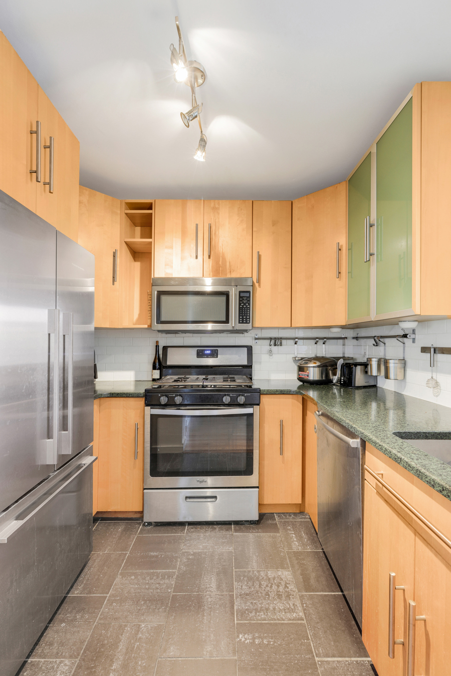 The bright and airy living room features beautiful hardwood floors, a Juliet balcony, and sunny western views overlooking Washington Market Park. The separate pass-through kitchen is outfitted with custom cabinetry, stainless steel appliances—including a dishwasher, gas range, and over-the-range microwave—making it both stylish and functional.